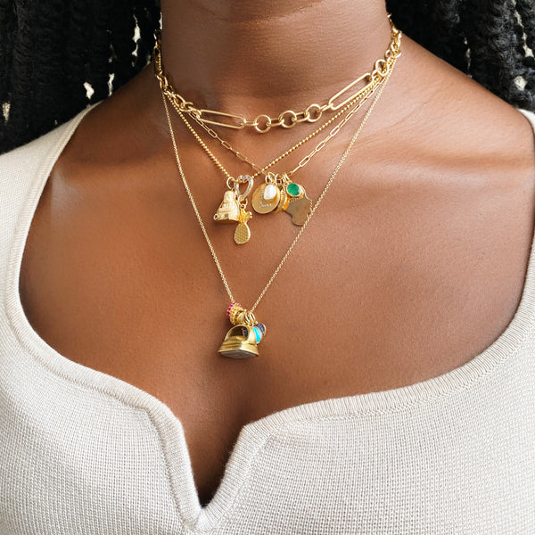 Amanda finds special meaning in having physical reminders of the places she’s visited and lived, and selected charms to help her hold on to precious memories! The pinecone represents her hometown, the clover represents her engagement, the peridot pineapple has a double meaning as it represents her tying the knot and is her grandmother’s birthstone. The teacup charm represents her trips to Europe and Asia. Last but not least, her emerald green Taurus intaglio represents her astrological sign and birthstone.
