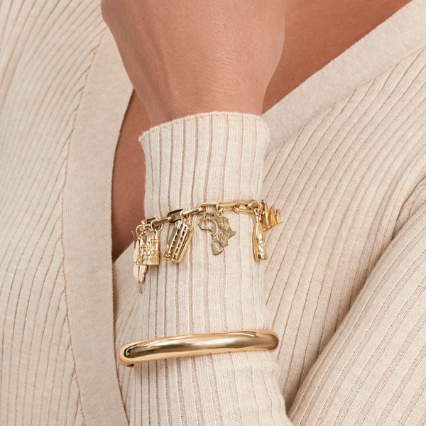 Andrea's best friend Emily made this bracelet for her! Emily wanted each charm to represent something meaningful and special to her dear friend. Andrea was born in South Africa but lives in New York which is why Emily chose the Africa & taxi charms. The plane marks the many places the friends have traveled together, and the labradoodle is for her pet dog. The calendar & vintage Aries ram disc represents Andrea's birthday. She is starting some new endeavors so Emily thought the horseshoe was the perfect charm to wish her luck.